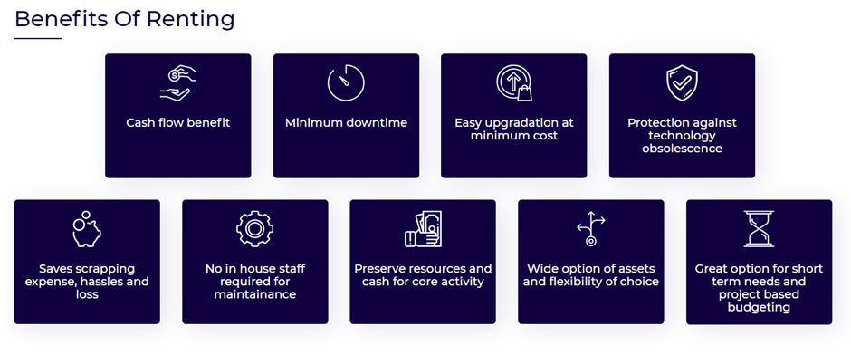 The benefits of renting are many. It allows you to use the technology as a service and pay for the duration that you are using it for instead of owning a depreciating asset when you buy it.